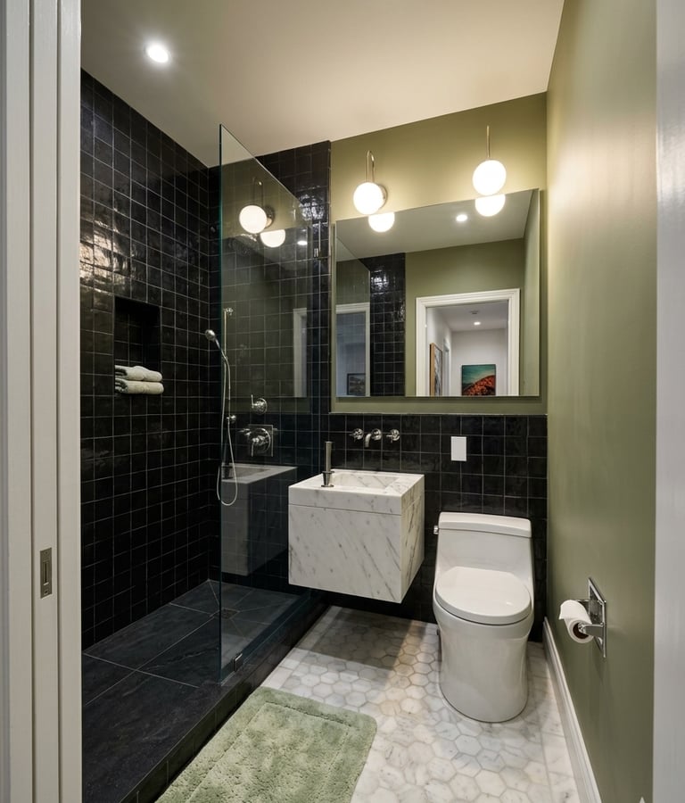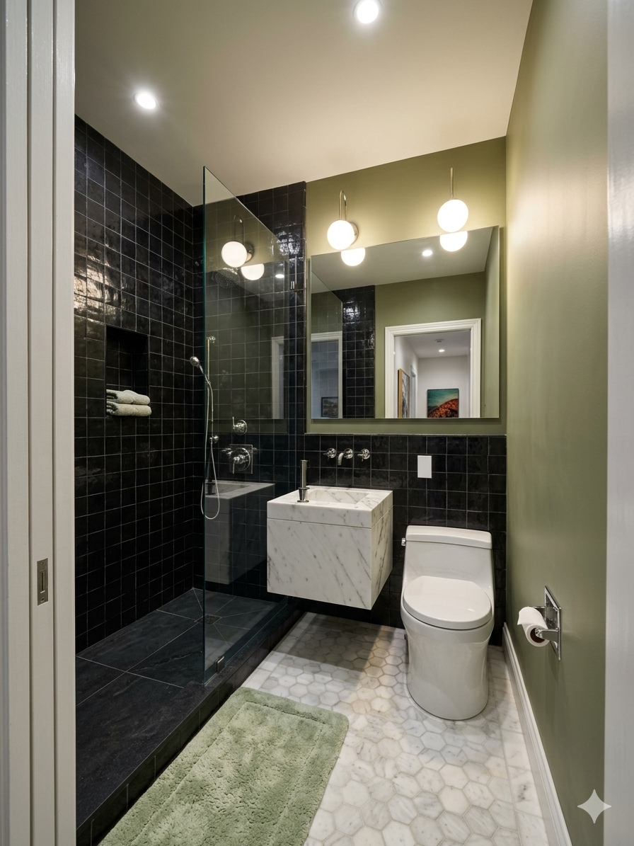 This bathroom renovation masterfully balances bold contrast with organic textures to create a sophisticated, high-end retreat. The striking black zellige-style wall tiles provide a deep, glossy backdrop that highlights the floating marble block vanity, while the classic white hexagon floor tiles offer a timeless foundation. By pairing moody olive-green walls with modern globe sconces and sleek chrome fixtures, the design achieves a "moody-meets-modern" aesthetic that feels both intimate and spacious. Below the surface, precise engineering was required to support the massive, 90+ lb marble vanity; the wall was stripped to the studs to install a custom-welded steel cantilever support system capable of distributing the immense torque and preventing structural failure. This attention to detail, from the seamless glass shower enclosure to the carefully integrated recessed shelving and hidden structural skeleton, maximizes the room’s footprint without sacrificing its distinct, luxury character.