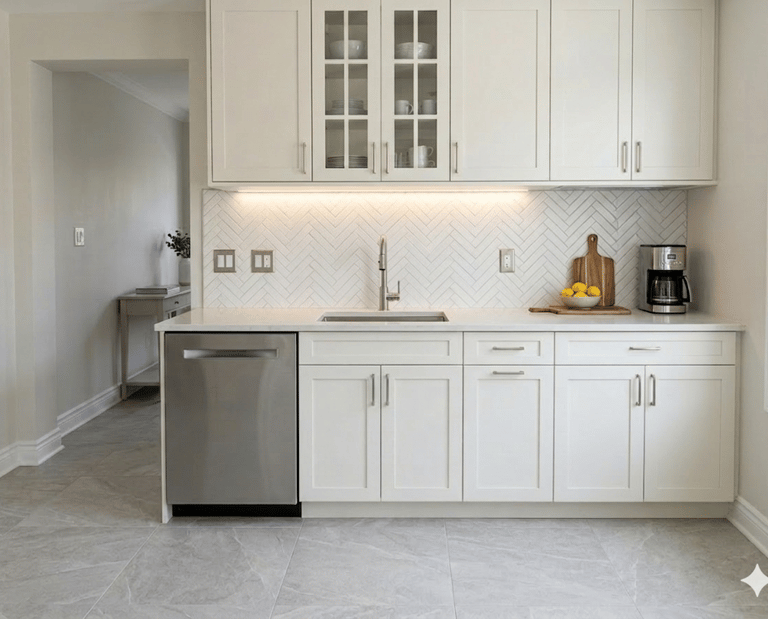 This renovation successfully bridged the gap between a chaotic construction site and a sophisticated, functional workspace. By replacing exposed plumbing and unfinished skeletons with bright white Shaker-style cabinetry and a seamless countertop, the room has been completely redefined. The addition of a classic herringbone tile backsplash provides subtle texture and depth, while the integration of modern stainless steel appliances and strategic under-cabinet lighting ensures the space is as practical as it is aesthetic. Grounded by durable, large-format stone-look floor tiles, the finished kitchen delivers a cohesive, high-end environment that prioritizes clean lines and a timeless, neutral palette.